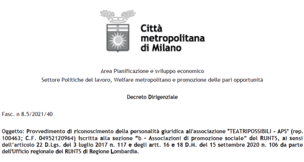 TEATRI POSSIBILI è un ente riconosciuto. Il conseguimento della personalità giuridica è un riconoscimento significativo che sottolinea il nostro impegno a operare secondo i più alti standard etici e legali.