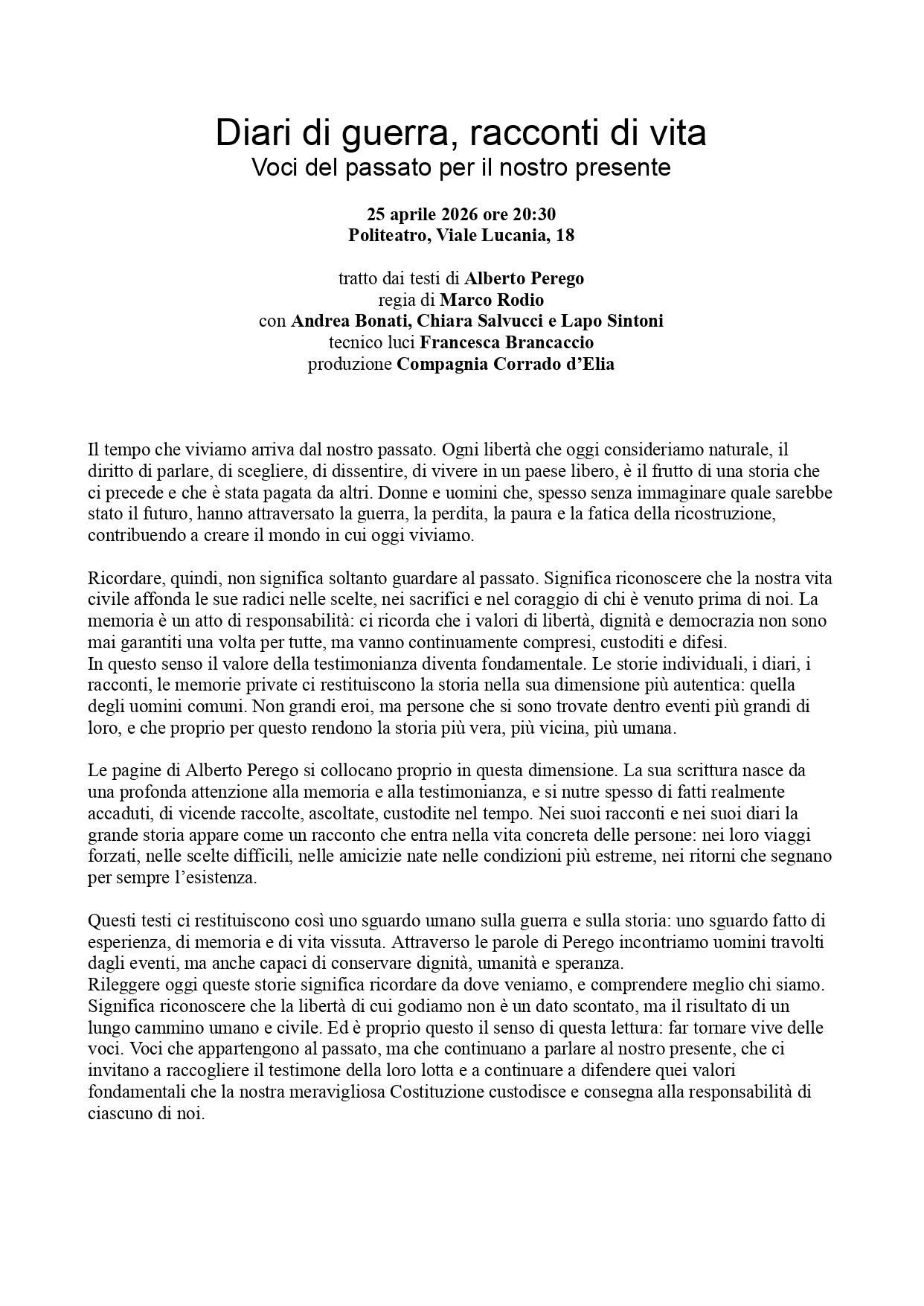 “Diari di guerra, racconti di vita – Voci del passato per il nostro presente” è un viaggio nella memoria attraverso le parole di Alberto Perego, interpretate da Andrea Bonati, Chiara Salvucci e Lapo Sintoni con la regia di Marco Rodio. Letture di racconti, storie e testimonianze che ci restituiscono la storia nella sua dimensione più umana.